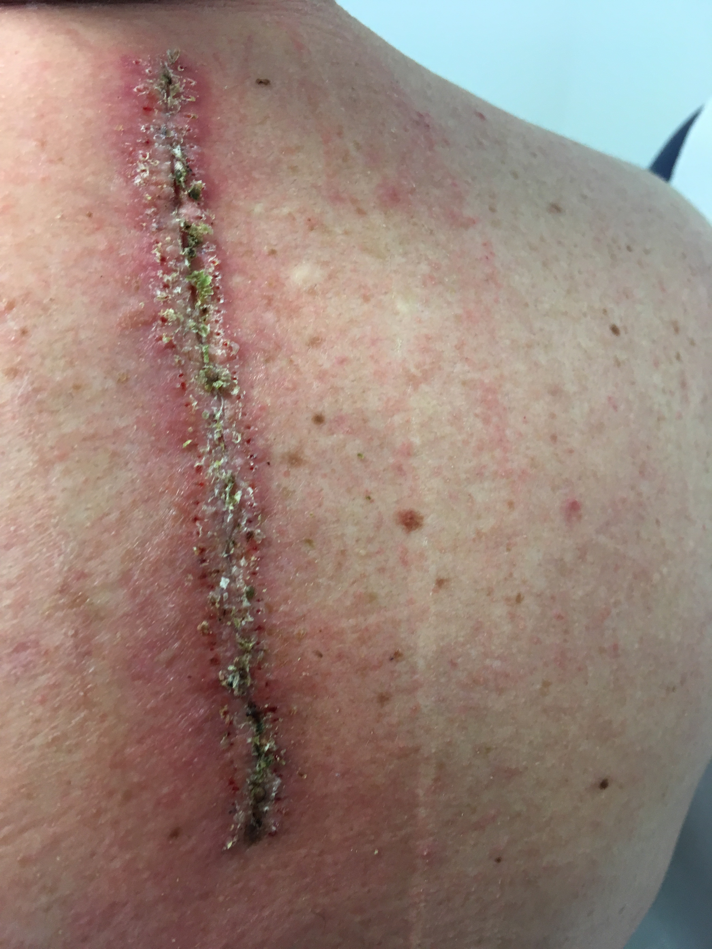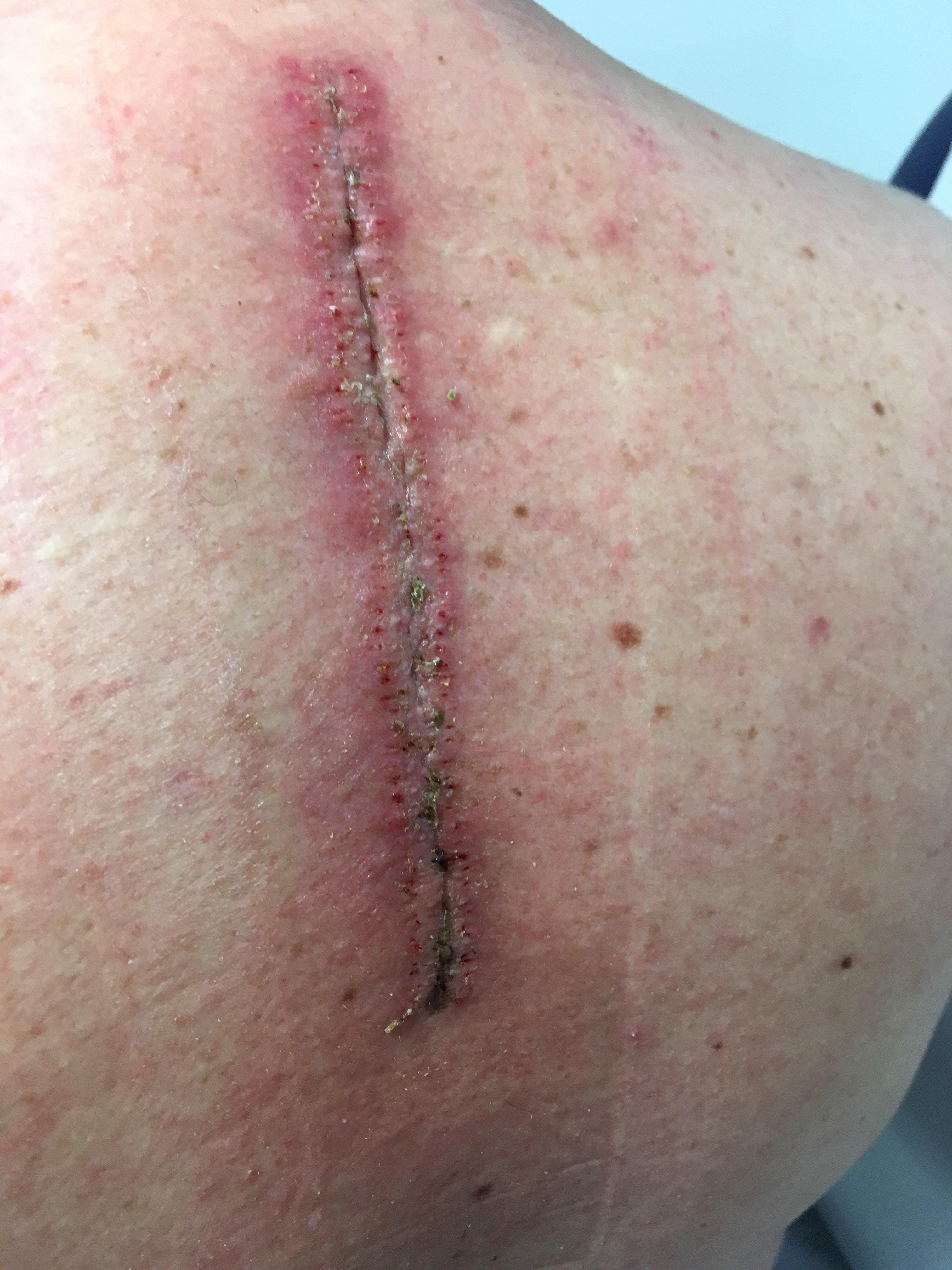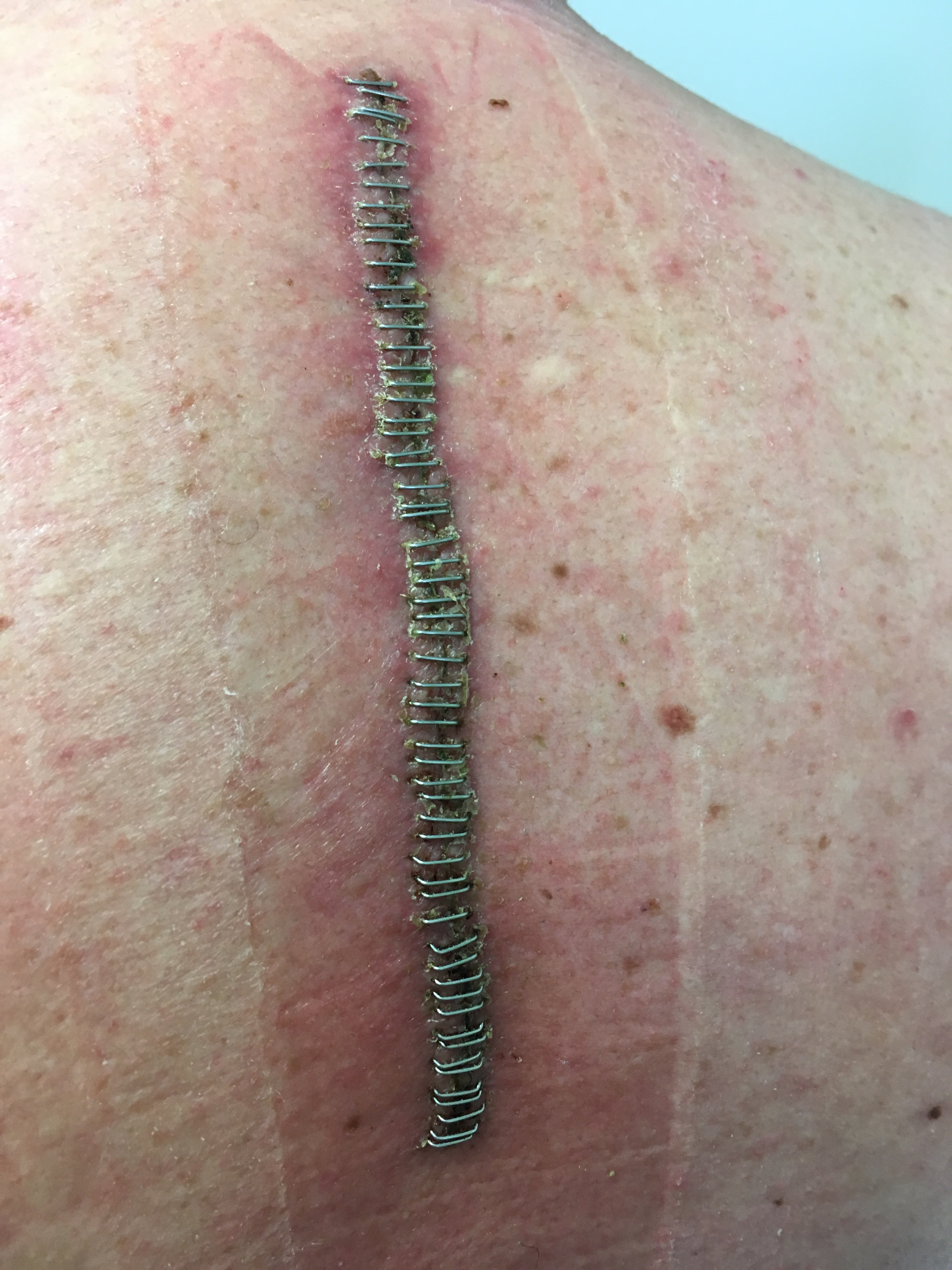 It is now 14 days since the op and time to get the stitches out. This was done by the nurse at my GP practice. Most came out with little bother but a few of them were quite uncomfortable. Like last year it felt more like needles going in than coming out. The nurse said it has healed really well, but has dressed it again with some op site to make sure I don’t get anything in the holes where the staples came out. I’ll go back to see her in a couple of days to check it again.