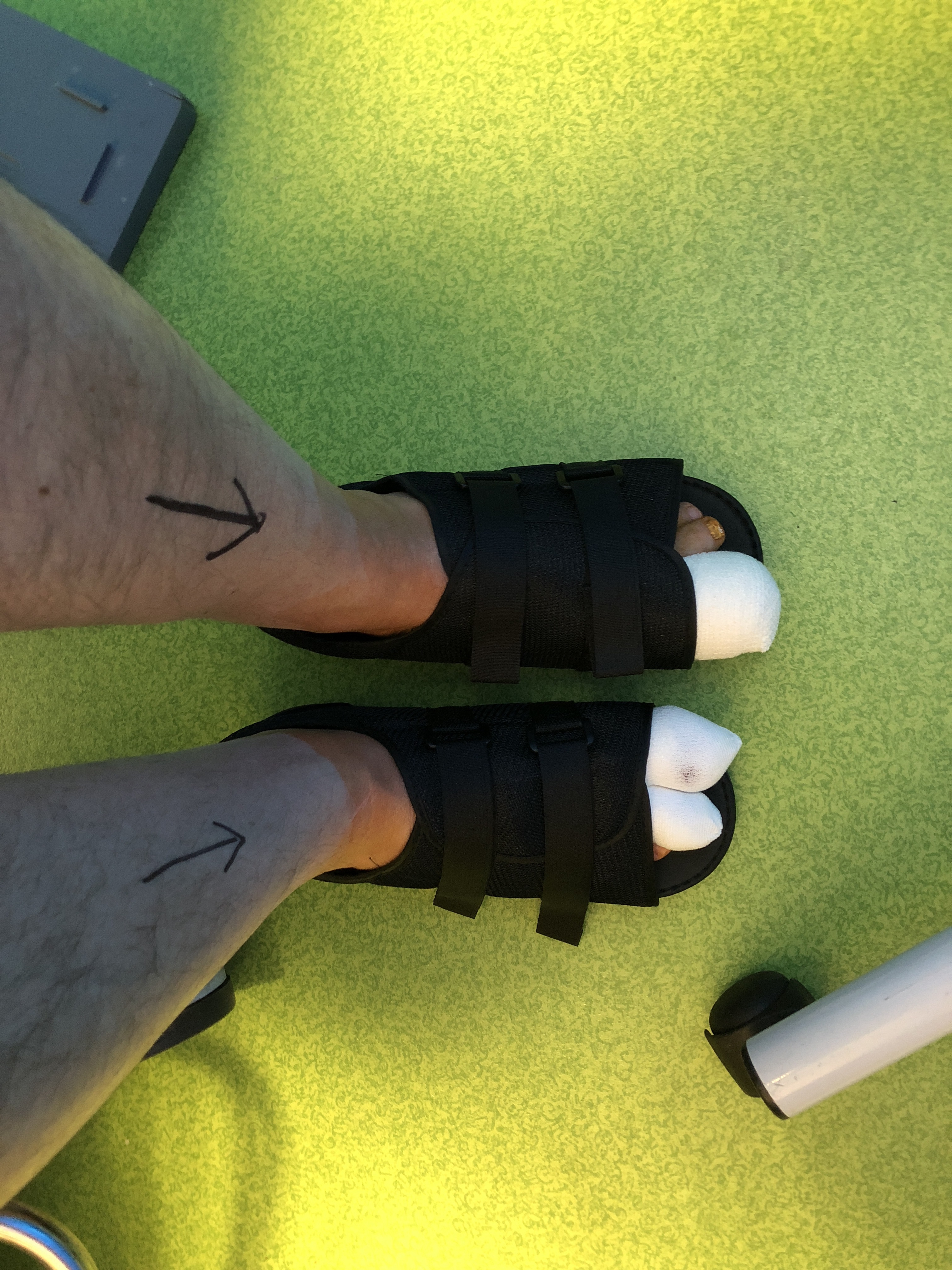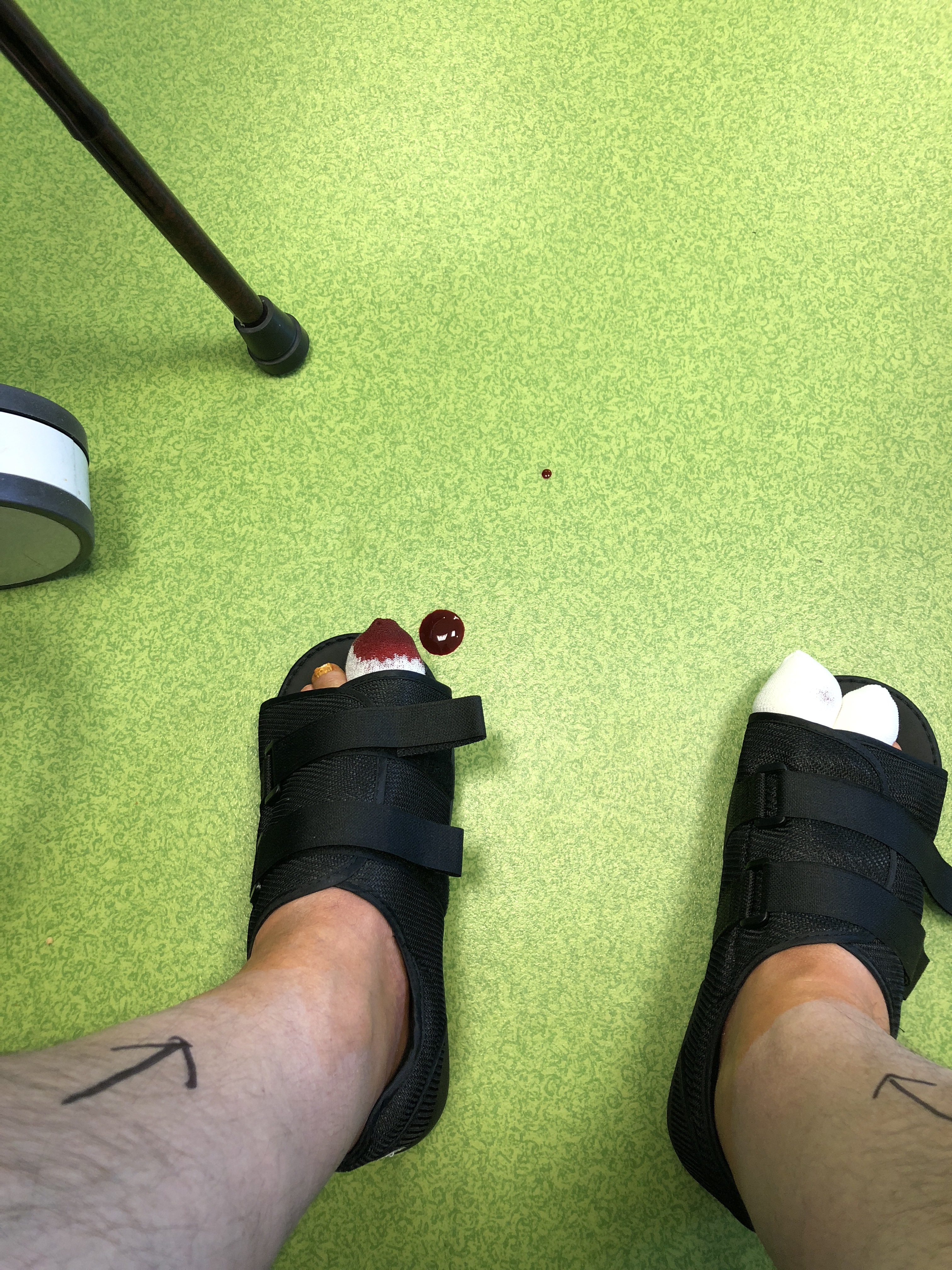 Surgery went well. I went down to theatre about 11.30, and came round in recovery at 13:05. After I’d been back on the ward for a while, physio came to give me some lovely plastic shoes to wear for a couple of weeks. She also gave me crutches instead of my stick. I had a little test walk across the bay and was ok. I needed the loo, so she said she’d walk me the 10-15m down the corridor. However, I’d only gone a couple of meters when they stopped me as I was leaving a blood trail from my left toe.