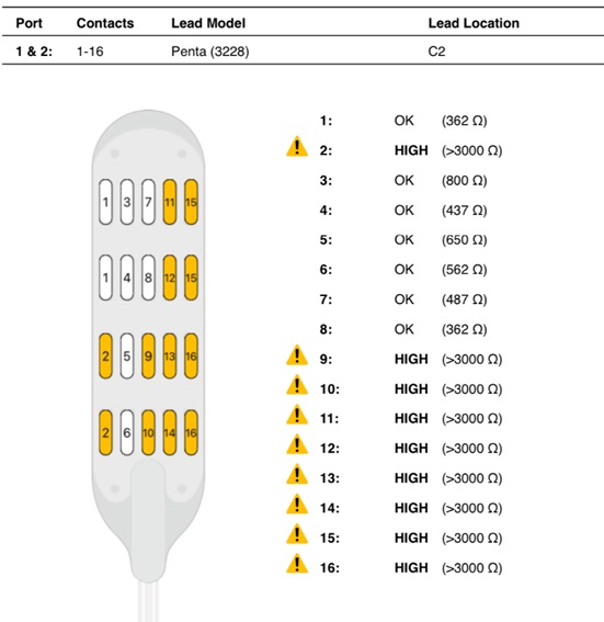 I mentioned previously that a number of the electrodes failed on the impedance test. Here’s the result of that test. They should all show as white, with orange showing where they failed. Not a good situation! 😮